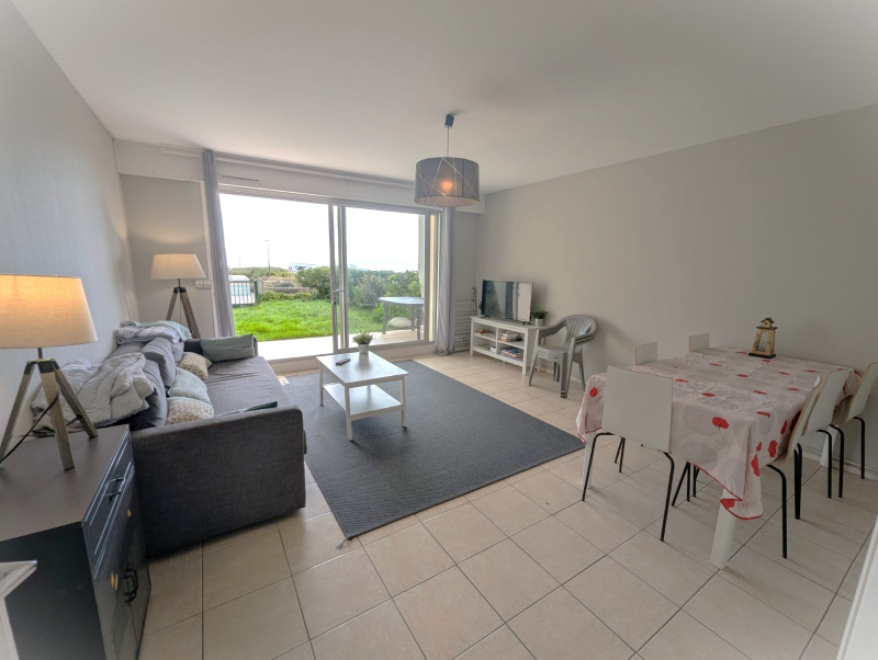Atouts du bien : .Situé en rez de jardin ce spacieux appartement composé d'une entrée, une cuisine équipée, une chambre , une salle d'eau, un wc indépendant, un séjour/salon donnant sur une terrasse avec un jardin privatif vue mer , une cave et un emplacement de parking.